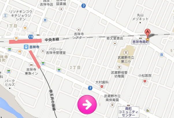 | 7アライフさんの右脇を通ります。そのままJR高架線沿いを歩きますと道が少し狭くなります。左にメガロス吉祥寺があります |